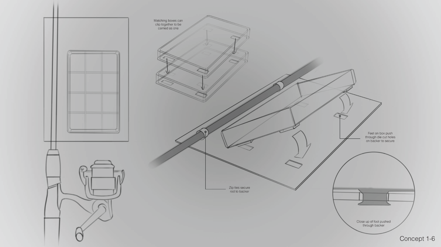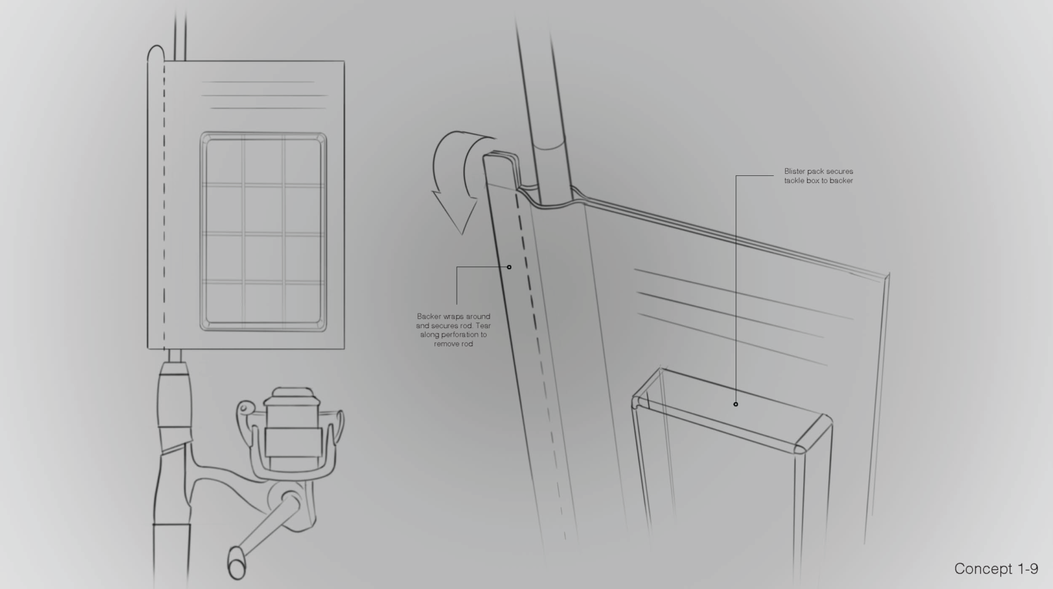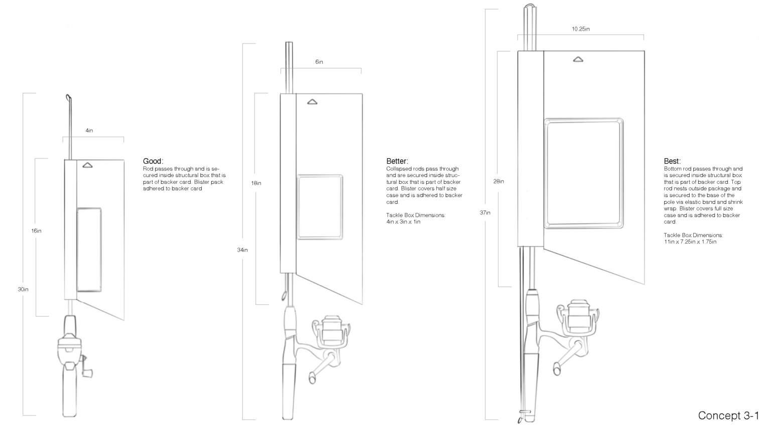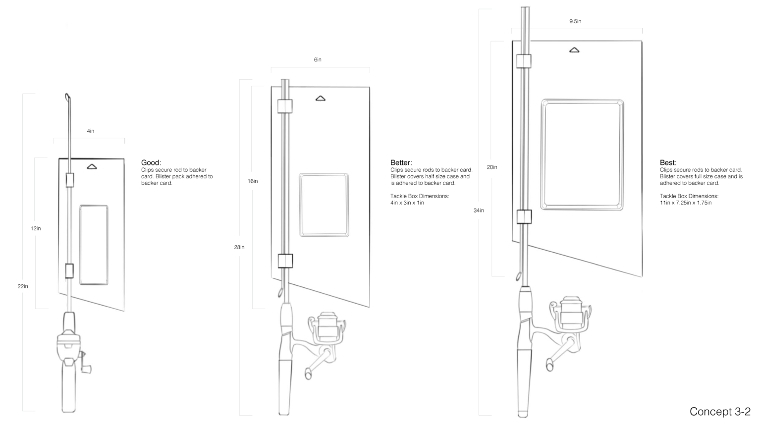 Design and develop packaging for a fishing rod and tackle box combo aimed at beginners seeking a starter kit to spark interest in fishing. The scope includes good/better/best packaging options for various rod and tackle box sizes. Explore innovative and interactive packaging solutions, ensuring the rod and tackle box are showcased together while meeting dimensional requirements for big-box retail shelving and POP displays.